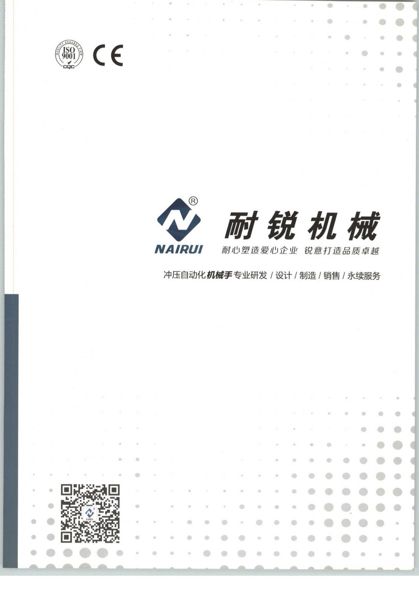 東莞市耐銳機械有限公司成立于2003年,公司廠房占地面積二十畝,擁有員工110余人,其中專業(yè)設計團隊15人,半數(shù)擁有本科及以上學歷。是一家專業(yè)致力于沖床周邊自動化設備的研發(fā)、生產(chǎn)、銷售企業(yè)。公司秉承著“耐心塑造愛心企業(yè),銳意打造卓越品質(zhì)”的企業(yè)宗旨和“篤守誠信,銳意進取,務實創(chuàng)新,專業(yè)服務”的企業(yè)精神,先進的生產(chǎn)工藝,高效的管理控制,完善的品質(zhì)體系,周到完備的售后服務,設計生產(chǎn)提供高速沖床周邊設備,品質(zhì)卓越,性能穩(wěn)定。通過多年的發(fā)展,公司已具備了專業(yè)化,規(guī)?;纳a(chǎn)能力。主要產(chǎn)品:二次元、三次元機械手、連桿機械手、獨立機械手、模內(nèi)機械手、拆垛機、高速滾輪送料機、新型高速夾式送料機、NCF滾輪送料機、精密整平機、三合一料架整平送料機、皮帶式高速齒輪更換式送料機及其它沖床周邊自動化設備。