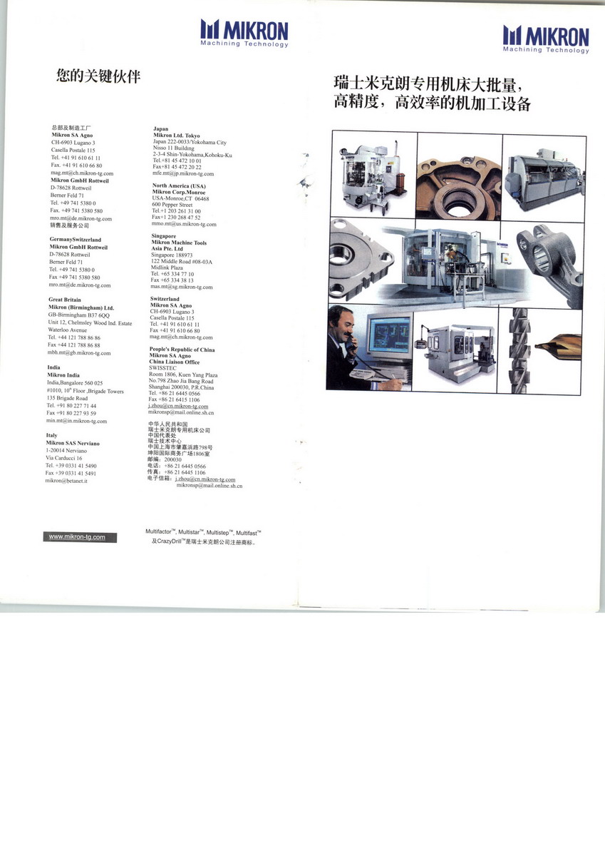 瑞士米克朗(Mikron)多工位組合機床(專機) 包括:米克朗組合機床 + 米克朗刀具. 米克朗用一臺設備(組合機床),可以從毛坯直接加工成--成品. 設備是交鑰匙工程. 毛坯可以是棒料、線材、鑄件、預加工件等等.對不同批次的不規(guī)則毛坯件,在機加工過程中,實現(xiàn)零點測量--自動補償公差. 多工位組合機床,效率高,產(chǎn)量大,重復精度和重復定位精度可達正負2.5個μ.(±0.0025 mm) 可從線材和棒料直接上料. 鑄件和其它種類毛坯件,可通過托盤或傳送帶自動上料. 瑞士米克朗公司成立于1908年,現(xiàn)有兩個集團:米克朗加工技術(shù)集團和米克朗裝配技術(shù)集團,是世界著名的機床制造商。 米克朗加工技術(shù)集團總部在瑞士Agno,在北京、上海、深圳、重慶設有銷售和售后服務機構(gòu)。主要產(chǎn)品為多工位組合加工機床和CNC柔性加工系統(tǒng),包括5個系列。Multistar、Multifactor、NRG-50、Namco系列為轉(zhuǎn)臺式多工位組合加工機床,Multistep系列為多單元柔性加工系統(tǒng)。 米克朗機床適合大批量生產(chǎn)各種中小型精密金屬件,適用行業(yè)廣泛,包括:汽車摩托車零部件如噴油器體、噴油嘴、動力轉(zhuǎn)向器、ABS制動器、ABS閥體、節(jié)氣門、空調(diào)壓縮機部件、油泵水泵部件、搖臂等;電/電子接插件;緊固件;液壓氣動閥件;冰箱壓縮機零件;眼鏡零件;手表零件;燃氣具零件;鎖零件;縫紉機旋梭;圓珠型書寫筆頭;精密零件等等。米克朗擁有自己的刀具制造工廠,米克朗刀具在中小型硬質(zhì)合金特種刀具和標準鉆頭行業(yè)享有盛譽。