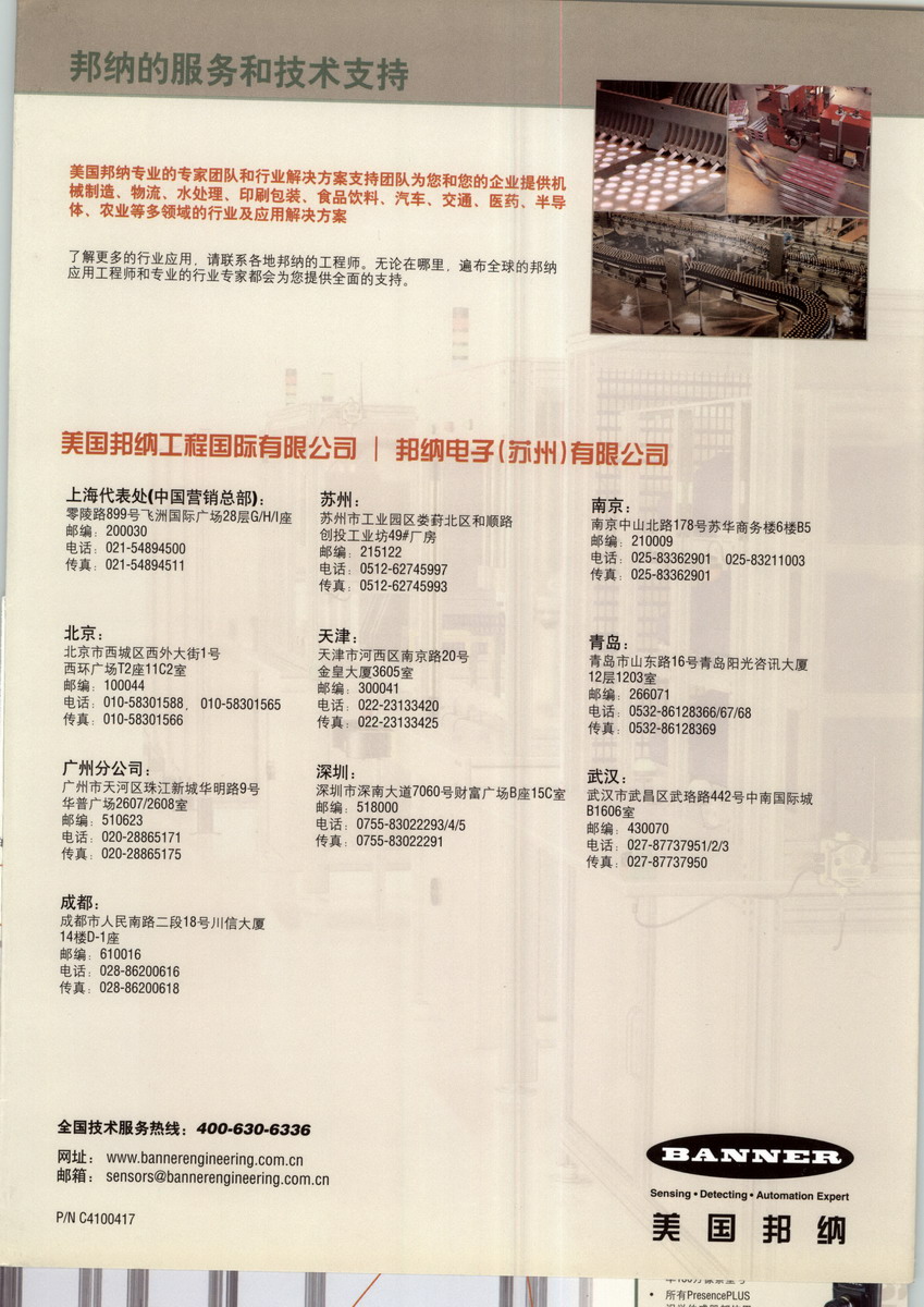 邦納電子(蘇州)有限公司是美國邦納在中國的全資子公司,總部位于美國的明尼蘇達州,是全球頂尖的自動化技術專家和整體解決方案提供者。公司擁有22,000多種產(chǎn)品,具有最為齊全的產(chǎn)品線,包括:光電傳感器、測量與檢測產(chǎn)品、工業(yè)無線網(wǎng)絡產(chǎn)品、視覺傳感器、安全產(chǎn)品、工業(yè)智能指示燈及旋轉編碼器系列,能滿足各種不同的檢測需求。在40多年的發(fā)展過程中,邦納公司始終將創(chuàng)新作為產(chǎn)品應用與研發(fā)的源動力。