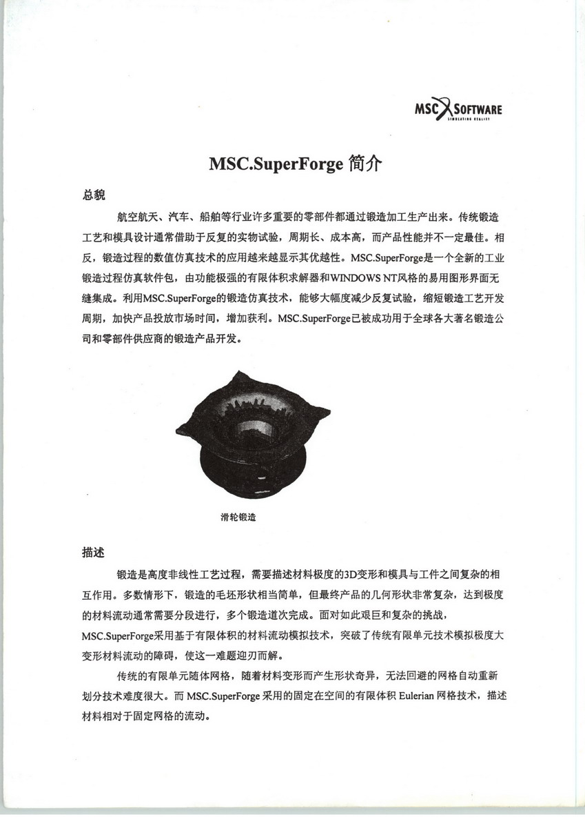 MSC軟件是世界十大原創(chuàng)軟件公司之一,是全球多學(xué)科仿真模擬領(lǐng)域的領(lǐng)導(dǎo)者。作為一家可被信任的企業(yè),MSC軟件公司能夠協(xié)助其合作公司在設(shè)計(jì)與測試其制造的產(chǎn)品方面提高質(zhì)量、節(jié)約時(shí)間并降低成本。各類院校、研究人員和學(xué)者利用MSC的先進(jìn)技術(shù),在拓展其獨(dú)有相關(guān)知識的同時(shí),延伸了其仿真模擬的應(yīng)用范圍。位居世界前列的各大生產(chǎn)廠商使用MSC軟件公司的工程仿真技術(shù),進(jìn)行線性和非線性的有限元分析(FEA)、聲學(xué)、流固耦合、多物理場、優(yōu)化、耐久性、多體動(dòng)力學(xué)以及控制系統(tǒng)的仿真模擬。這些工具能夠真實(shí)準(zhǔn)確地預(yù)測工業(yè)產(chǎn)品在真實(shí)世界中的性能表現(xiàn),從而協(xié)助工程師設(shè)計(jì)出更富有創(chuàng)新力的產(chǎn)品——并且更加快速、成本利用更加有效。