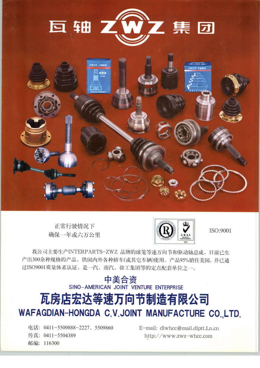 瓦房店宏達(dá)等速萬(wàn)向節(jié)制造有限公司是由中國(guó)最大的軸承生產(chǎn)企業(yè) --瓦房店軸承集團(tuán)有限責(zé)任公司(ZWZ)與美國(guó)英特博公司(INTERPARTS)于1994年共同投資興辦的合資企業(yè)。瓦軸集團(tuán)于1983年就開(kāi)始對(duì)球籠式等速萬(wàn)向節(jié)進(jìn)行研制和開(kāi)發(fā),并在1989年生產(chǎn)出中國(guó)第一個(gè)萬(wàn)向節(jié)。球籠式等速萬(wàn)向節(jié)產(chǎn)品屬于軸承邊緣產(chǎn)品,在技術(shù)上既依靠瓦軸集團(tuán)的技術(shù),又引進(jìn)合資方美國(guó)英特博公司(INTERPARTS)的技術(shù),經(jīng)過(guò)10多年的研制和開(kāi)發(fā),現(xiàn)已形成獨(dú)特的生產(chǎn)技術(shù)。 目前已經(jīng)為一汽CA141K2T5型4*4越野卡車(chē),北汽霸道,南汽軍車(chē),江南奧拓,浙江吉利汽車(chē)公司生產(chǎn)的“美日、優(yōu)利歐、自由艦”牌轎車(chē),徐工集團(tuán)工程車(chē)等配套; 并為冶金、石油及機(jī)床等行業(yè)配套。2000年5月公司又一次性通過(guò)英國(guó)勞氏船級(jí)社ISO:9001國(guó)際質(zhì)量體系認(rèn)證。 2003年11月,我公司一次性通過(guò)英國(guó)勞氏船級(jí)社(LRQA)ISO/TS 16949:2002國(guó)際質(zhì)量體系認(rèn)證審核。 1999年8月江澤民總書(shū)記親切接見(jiàn)瓦房店宏達(dá)等速萬(wàn)向節(jié)制造有限公司董事長(zhǎng)。