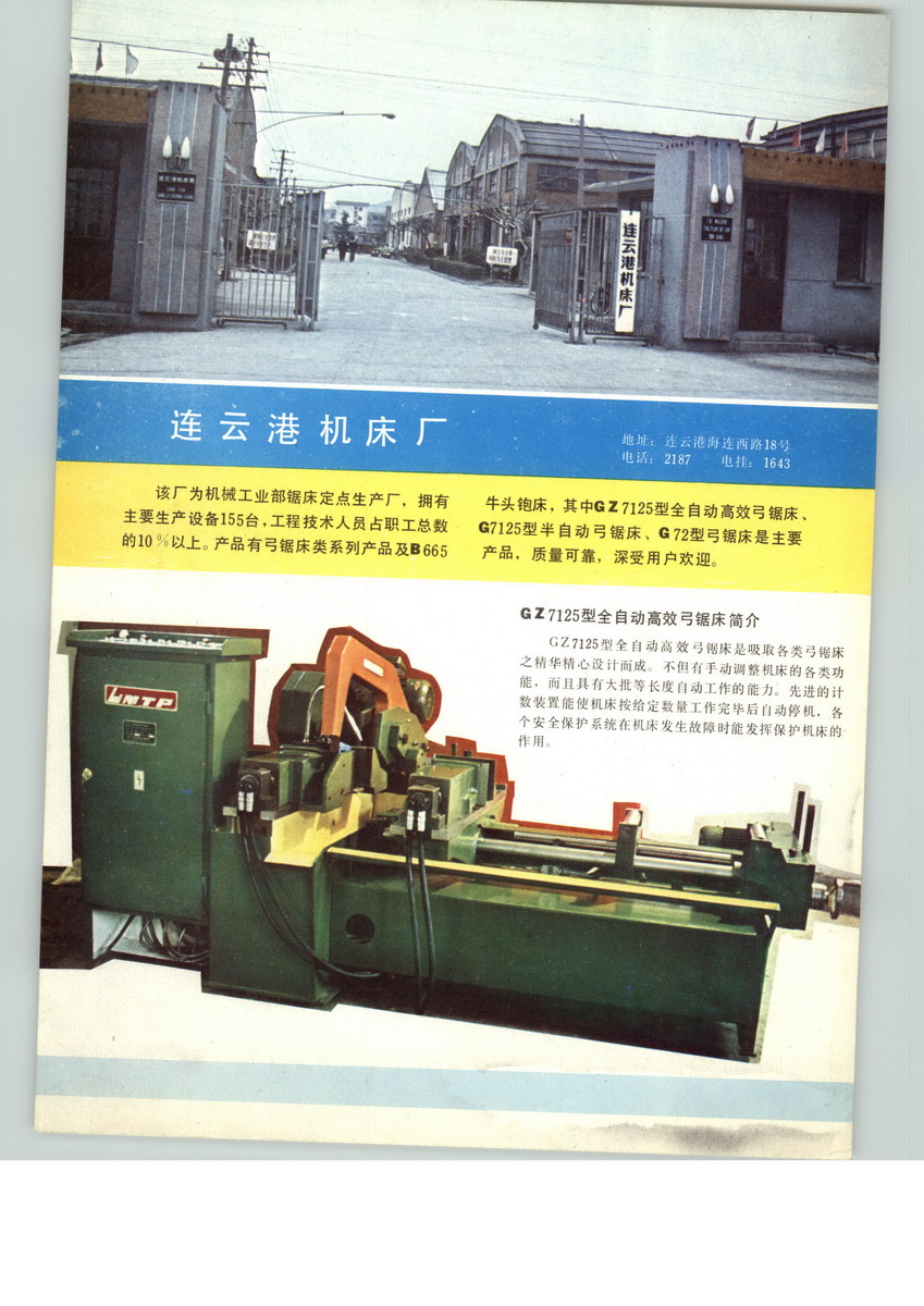 連云港機(jī)床廠有限公司(原連云港機(jī)床廠)位于黃海之濱、新亞歐大陸橋東橋頭堡、美麗的港口城市-連云港市。連云港機(jī)床廠有限公司創(chuàng)建于1967年2月。2.1萬(wàn)平方米的占地面積,1.45萬(wàn)平方米的廠房建筑,150余臺(tái)套高精度的生產(chǎn)設(shè)備,使其擁有年產(chǎn)3000余臺(tái)套各類金屬鋸床的生產(chǎn)能力。優(yōu)美的環(huán)境,便捷的交通,特殊的地理位置,加上優(yōu)秀的加工,使得連云港機(jī)床廠有限公司充滿朝氣。1994年,我廠與日本天田株式會(huì)社合資興建了天田連云港機(jī)械有限公司,注冊(cè)資金620萬(wàn)美元,主要產(chǎn)品為AMADAΦ250系列帶鋸床、雙金屬帶鋸條,產(chǎn)品質(zhì)量擠身世界一流。經(jīng)過(guò)三十余年的努力與奮斗,公司已發(fā)展成為中國(guó)規(guī)模最大的鋸削裝備的生產(chǎn)基地,2002年名列中國(guó)機(jī)床工具行業(yè)企業(yè)效績(jī)?cè)u(píng)比綜合得分第一。主要產(chǎn)品有Φ160--500mm全系列臥式弓鋸床及Φ250--1300mm全系列帶鋸床?!斑B機(jī)”弓鋸床、帶鋸床被授于江蘇省名牌產(chǎn)品稱號(hào),連續(xù)多年被國(guó)家質(zhì)量技術(shù)監(jiān)督局抽查為合格產(chǎn)品。公司近四十余年的生產(chǎn)經(jīng)驗(yàn),加上完美的ISO9000質(zhì)量管理體系,必將使廣大顧客的需求得到最大的滿足,并與廣大顧客共創(chuàng)美好的明天 。