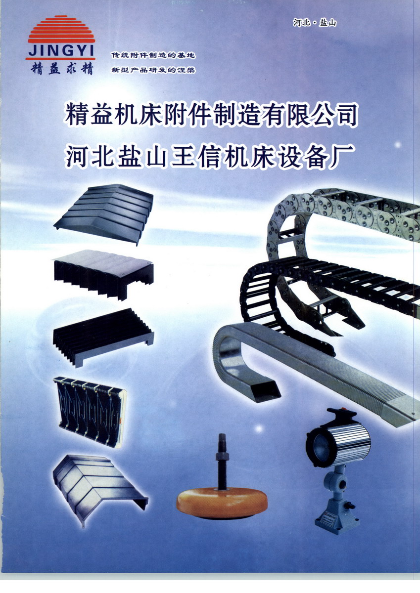 鹽山縣精益機床附件制造有限公司為機床附件專業(yè)生產(chǎn)單位,東臨渤海,有便利的205國道,西有暢通的京滬、京九鐵路,坐落在美麗的漳衛(wèi)新河河畔,她始建于1984年,集開發(fā)、設(shè)計、制造銷售于一體。是機床附件、防護裝置生產(chǎn)歷史較早、專業(yè)性強、技術(shù)力量雄厚、國內(nèi)同行業(yè)規(guī)模較大企業(yè)。我公司依靠科技開發(fā)產(chǎn)品,企業(yè)充滿活力,產(chǎn)品廣泛用于國內(nèi)外各種機床和設(shè)備的維護上。我們的產(chǎn)品有:柔性風琴式防護罩(皮老虎)、鋼板不銹鋼導軌護罩、伸縮式絲杠護罩、卷簾防護罩、防護裙簾、防塵折布、鋼制拖鏈、工程塑料拖鏈、機床工作燈、機床墊鐵、JR—2型矩形金屬軟管、DGT導管防護套、可調(diào)塑料冷卻管、吸塵管、通風管、防爆管、行程槽板、撞塊、排屑機、偏擺儀、平臺及各種操作件。