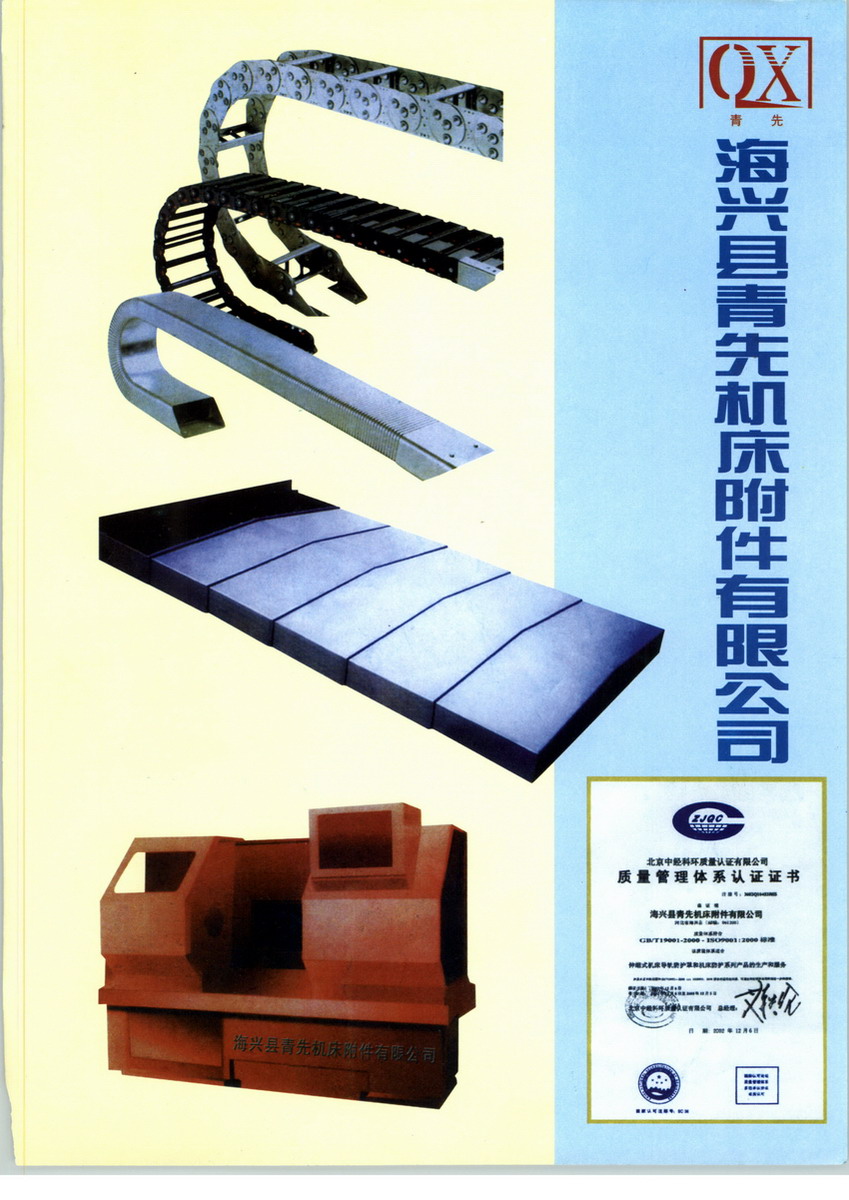 海興縣青先機床附件有限公司創(chuàng)建于1992年,2003年改制為股份有限公司,主要生產(chǎn)數(shù)控機床配套部件,產(chǎn)品有導(dǎo)軌防護罩,排屑機,機床外防護,塑料、鋼制拖鏈,各種鈑金件,產(chǎn)品遍布全國各地。 我公司依靠科技開發(fā)產(chǎn)品,用戶遍布全國各地,擁有激光切割機、數(shù)控折彎機、數(shù)控剪板機、氣體保護焊機等一大批國際先進的鈑金加工設(shè)備。并于2008年通過了ISO9001-2000質(zhì)量體系認證。 我公司致力于開拓創(chuàng)新、不斷改造完善,為用戶提供最好、更新的現(xiàn)代化新產(chǎn)品,并通過完善的售后服務(wù)來滿足您的愿望與需求,歡迎各單位選用我公司生產(chǎn)的系列產(chǎn)品。我們愿與您忠誠合作、共同發(fā)展。