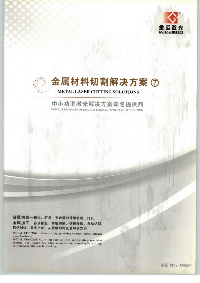 武漢金運(yùn)激光股份有限公司,是專業(yè)集研發(fā)、生產(chǎn)和銷售于一體的中小功率激光切割加工解決方案提供商,2005年成立2011年上市,企業(yè)股票代碼:300220。