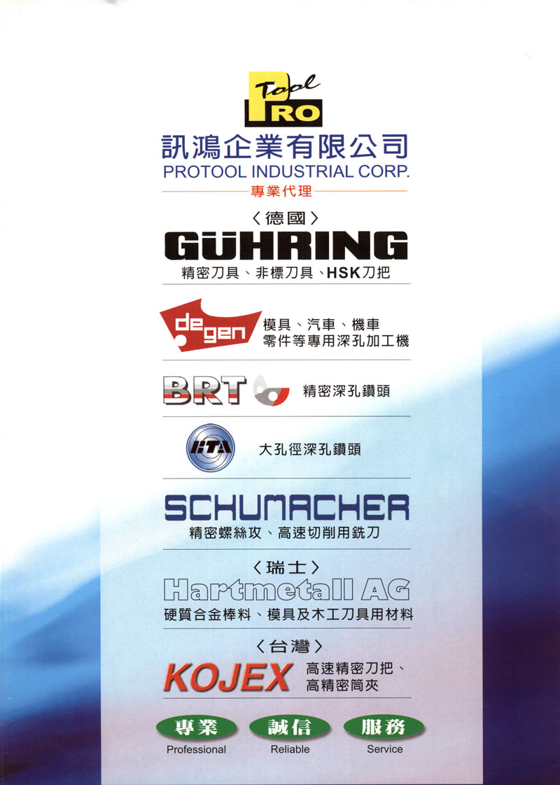 訊鴻公司是由總經(jīng)理鄭文照創(chuàng)立,專(zhuān)業(yè)背景備受推崇,不但銷(xiāo)售能力受肯定,并可提供完善的售后服務(wù)。目前該公司主要代理品包括德國(guó)BRT精密深孔鉆頭及德國(guó)RINECK模具高轉(zhuǎn)速精密刀把,及德國(guó)知名切削刀具等。