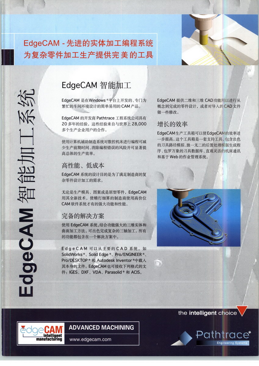 EdgeCAM是由英國(guó)Pathtrace工程系統(tǒng)公司開發(fā)的一套智能數(shù)控編程系統(tǒng);主要應(yīng)用在數(shù)控銑、數(shù)控車和數(shù)控線切割等領(lǐng)域;該公司成立于1982 年,總部位于英國(guó)伯克郡雷丁市,多年從事CAD/CAM軟件系統(tǒng)的研發(fā)和技術(shù)服務(wù),其產(chǎn)品EdgeCAM在模具加工、工具制造、機(jī)床生產(chǎn)等行業(yè)具有重要的影響力,被權(quán)威機(jī)構(gòu)評(píng)為“世界上裝機(jī)量和銷售量增長(zhǎng)最快的公司之一”,并且“在車削、車銑和多軸銑切編程技術(shù)開發(fā)方面處于世界領(lǐng)先地位,在模具行業(yè)也具有出色的表現(xiàn)”。Pathtrace公司在全球的許多地區(qū)建立了分公司和辦事處,并且與多家CAD軟件開發(fā)商建立戰(zhàn)略伙伴關(guān)系,使產(chǎn)品具備了更為廣泛的適用性。為配合中國(guó)市場(chǎng)的發(fā)展并滿足中國(guó)客戶的需要,Pathtrace公司在北京設(shè)立了中國(guó)辦事處,進(jìn)行EdgeCAM軟件系統(tǒng)的本地化工作,以便更好地服務(wù)于中國(guó)市場(chǎng)。