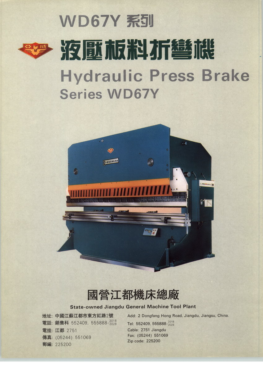 全國(guó)折灣機(jī)、剪板機(jī)產(chǎn)銷量最大的企業(yè)──江都機(jī)床總廠廠長(zhǎng)袁以信創(chuàng)建于1956年的國(guó)營(yíng)江都機(jī)床總廠,是機(jī)械工業(yè)部定點(diǎn)專業(yè)生產(chǎn)板料加工機(jī)械的省屬中型企業(yè),現(xiàn)有職工1000余名,專業(yè)技術(shù)人員205人,其中,具有高級(jí)職稱的10多人,中級(jí)職稱的40多人,占職工總數(shù)的20%以上。全廠占地面積近12萬(wàn)平方米,廠房面積21700平方米,擁有固定資產(chǎn)原值3000多萬(wàn)元,各類加工設(shè)備260余臺(tái),精大稀設(shè)備30臺(tái),機(jī)械加工設(shè)備和檢測(cè)手段完備。全廠現(xiàn)有六個(gè)生產(chǎn)車間和板焊、鑄鍛、熱處理、模具四個(gè)專業(yè)化分廠。廠辦機(jī)械研究所,具有產(chǎn)品開發(fā)設(shè)計(jì)能力,每年可自行開發(fā)新品2~3個(gè)?,F(xiàn)行主產(chǎn)品為:16t、25t、40t、63t、100t、160t、250t、400t8?jìng)€(gè)品種的板料折彎?rùn)C(jī)(有普遍的和數(shù)控的);63t和100t的PC控制或數(shù)控折剪兩用機(jī);6×2500、6×3200、8×5000、12×3200、16×2500、20×3200、32×25007個(gè)品種的液壓剪板機(jī)(有普通的和數(shù)控的)。