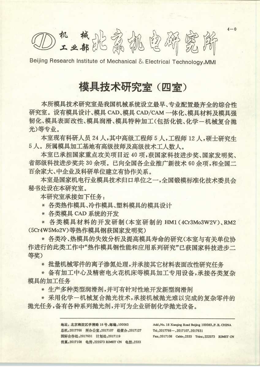 北京機(jī)電研究所主要從事金屬塑性成形技術(shù)與裝備、金屬熱處理技術(shù)與裝備、真空熱處理技術(shù)與裝備、模具技術(shù)、汽車內(nèi)飾件成形技術(shù)及裝備、精沖技術(shù)及裝備、工業(yè)機(jī)器人及自動(dòng)化控制系統(tǒng)、工程測(cè)試、新材料、金屬超塑性技術(shù)、多種電源研制技術(shù)等多行業(yè)的研究開(kāi)發(fā)工作。不僅可為企業(yè)提供單機(jī)設(shè)備,還可提供集成了工藝、裝備及自動(dòng)物流系統(tǒng)的鍛壓、熱處理全自動(dòng)生產(chǎn)線。北京機(jī)電研究所的產(chǎn)品,如輥鍛機(jī)、楔橫軋機(jī)、離合器式螺旋壓力機(jī)、鍛造機(jī)械手、機(jī)器人、真空爐、精沖模具、內(nèi)飾件成形模具等,在國(guó)內(nèi)享有很高的聲譽(yù),一些產(chǎn)品還出口日本、韓國(guó)、馬來(lái)西亞、泰國(guó)、緬甸、巴基斯坦、敘利亞、香港等亞非國(guó)家和地區(qū)。北京機(jī)電研究所始終把技術(shù)創(chuàng)新作為提升核心競(jìng)爭(zhēng)力的主要戰(zhàn)略方針,形成了從實(shí)際出發(fā)不斷創(chuàng)新發(fā)展的企業(yè)文化和與之相適應(yīng)的科學(xué)管理體系,為科研人員創(chuàng)造了良好的技術(shù)創(chuàng)新環(huán)境與氛圍。多年的研究開(kāi)發(fā)工作為本所培養(yǎng)和造就了一支以工程院院士為首的、年齡結(jié)構(gòu)合理、專業(yè)搭配得當(dāng)、理論基礎(chǔ)扎實(shí)、實(shí)踐經(jīng)驗(yàn)豐富、思想活躍、作風(fēng)嚴(yán)謹(jǐn)、業(yè)務(wù)素質(zhì)高、創(chuàng)新能力強(qiáng)的技術(shù)隊(duì)伍。北京機(jī)電研究所從事塑性成形、熱處理、模具等技術(shù)領(lǐng)域的研發(fā)已有50多年的歷史,具有雄厚的研究基礎(chǔ),并形成了相關(guān)技術(shù)領(lǐng)域的綜合性優(yōu)勢(shì)、積累了豐富的工程經(jīng)驗(yàn),并取得了一批達(dá)到國(guó)際先進(jìn)水平的成果。在聯(lián)合開(kāi)發(fā)和成果轉(zhuǎn)讓過(guò)程中,北京機(jī)電研究所與國(guó)內(nèi)眾多裝備制造骨干企業(yè)友好合作,建立了戰(zhàn)略合作伙伴關(guān)系。北京機(jī)電研究所一貫重視國(guó)際交流與合作,已與30多個(gè)國(guó)家和地區(qū)的國(guó)際知名大學(xué)、研究院所和企業(yè)建立了交流與合作關(guān)系,完成了數(shù)十項(xiàng)國(guó)際合作研究項(xiàng)目。