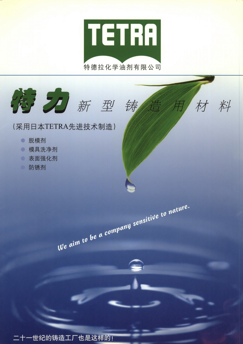 上海特德拉化學(xué)劑有限公司于2000年9月建立,制造和銷售于一體,是國(guó)內(nèi)唯一生產(chǎn)鑄造用脫模劑的專業(yè)公司,特德拉公司秉承“質(zhì)量第一、用戶第一”的企業(yè)理念,向用戶提供優(yōu)質(zhì)高效的“特力”系列產(chǎn)品。公司一直致力于無(wú)環(huán)境污染、無(wú)公害、無(wú)火災(zāi)危險(xiǎn)、低用量高效能、節(jié)省資源的化學(xué)油品的研究與開發(fā)。多年來(lái),積累了豐富的經(jīng)驗(yàn),具有強(qiáng)大的技術(shù)實(shí)力,其產(chǎn)品廣泛使用于日本的鑄造廠家,尤其在日本的汽車鑄造廠家,更是一支獨(dú)秀,為日本汽車工業(yè)的發(fā)展作出了貢獻(xiàn)。上海特德拉化學(xué)油劑有限公司是日本株式會(huì)社テトラ(tetra)于2000年9月建立的獨(dú)立公司。主要生產(chǎn)和銷售“脫模劑”、“防銹劑”、“清洗劑”、“電子觸點(diǎn)潤(rùn)滑防銹劑”。