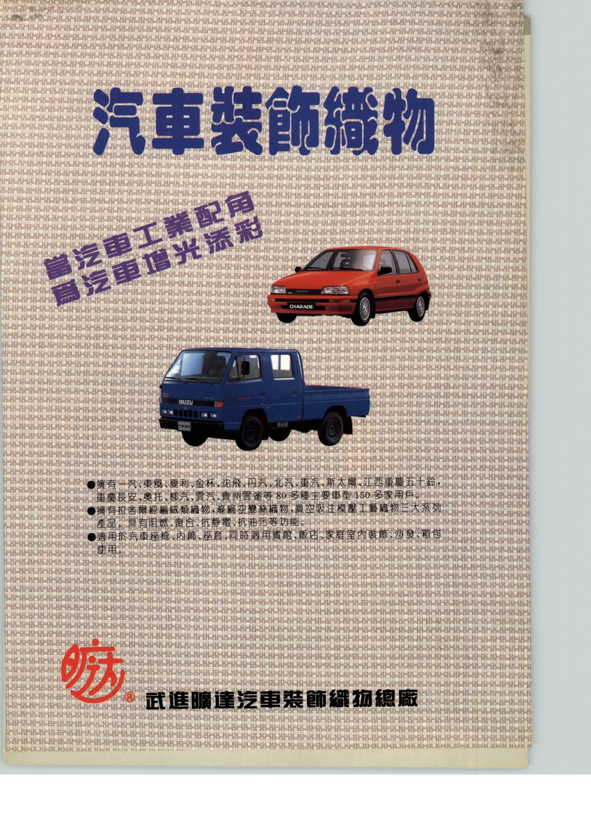 多年來(lái),曠達(dá)以“甘當(dāng)汽車工業(yè)的配角,為汽車內(nèi)飾爭(zhēng)光添彩”為配套宗旨,以中國(guó)汽車零部件工業(yè)“高起點(diǎn)、大批量、專業(yè)化”為發(fā)展方針,不斷進(jìn)行技術(shù)改造,先后從德國(guó)、意大利、比利時(shí)、法國(guó)、美國(guó)、英國(guó)引進(jìn)世界先進(jìn)的織造、染整等設(shè)備200多臺(tái)套,形成年產(chǎn)各類汽車內(nèi)飾面料2000萬(wàn)米的生產(chǎn)能力。產(chǎn)品有7大系列1500多個(gè)花式品種,已被國(guó)內(nèi)大部分汽車制造商廣泛應(yīng)用于座椅、車頂、車圍、門板等內(nèi)裝飾,目前主要配套廠商有:一汽、一汽大眾、上海大眾、東風(fēng)汽車、東南汽車、南京汽車、上汽奇瑞、浙江吉利、鄭州宇通、江玲汽車、廈門金龍、沈陽(yáng)金杯、上汽通用五菱、哈飛汽車、昌河汽車等,國(guó)內(nèi)市場(chǎng)占有率38%以上?!皶邕_(dá)牌”汽車內(nèi)飾面料以色彩協(xié)調(diào)、抗靜電、抗油污、陰燃性、耐摩擦等顯著優(yōu)點(diǎn),曾先后榮獲農(nóng)業(yè)部科技進(jìn)步獎(jiǎng),中國(guó)鄉(xiāng)鎮(zhèn)企業(yè)局科技獎(jiǎng),創(chuàng)新基金項(xiàng)目,火炬計(jì)劃項(xiàng)目,中國(guó)專利博覽會(huì)金獎(jiǎng),江蘇省產(chǎn)品等,03年又被列入國(guó)家火炬計(jì)劃武進(jìn)新材料產(chǎn)業(yè)基地骨干企業(yè)。