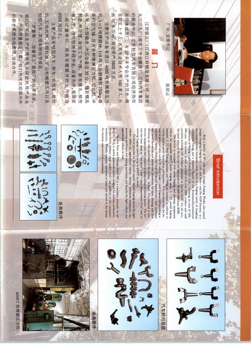 江西江鈴鍛造有限公司 江西省新余市分宜鎮(zhèn)祥山路610信箱 企業(yè)名稱 江西鍛壓廠(江西江鈴鍛造有限公司) 交通狀況 廠區(qū)北臨浙贛線,通往贛西腹地的大動脈分(宜)文(竹)鐵路隔墻而過,新修的清萍公路,使交通便利。 電 話 0790-5883594 傳 真 0790-5883604 主要產(chǎn)品及生產(chǎn)規(guī)模 江鈴N系列轉(zhuǎn)向節(jié)、直臂、彎臂,江鈴皮卡轉(zhuǎn)向節(jié),全順轉(zhuǎn)向節(jié),沈陽金杯轉(zhuǎn)向節(jié),保定長城皮卡轉(zhuǎn)向節(jié),揚(yáng)子一汽皮卡轉(zhuǎn)向節(jié)等產(chǎn)品,年生產(chǎn)鍛件可達(dá)10000噸。 企業(yè)人數(shù) 659 專業(yè)人員 133 基礎(chǔ)設(shè)施 工廠占地面積12.13萬平方米,其中廠房總面積1.49萬平方米。設(shè)備有:俄產(chǎn)400噸熱模鍛壓力機(jī),1-3噸模鍛錘, 1-3噸自由鍛錘和150kg-750kg系列空氣錘等設(shè)備。 總資產(chǎn) 萬 固定資產(chǎn) 2275萬 流動資產(chǎn) 2651萬 租賃 主要設(shè)備 俄產(chǎn)40噸熱模鍛壓力機(jī)(新),2噸電液錘(新),1-3噸模鍛錘和150kg-750kg系列空氣錘及配套的摩擦壓力機(jī)等。 閑置設(shè)備 1-3噸自由鍛錘各一臺,250kg、400kg、750kg空氣錘各一臺,250T棒料機(jī)一臺,L6120拉床一臺 廠房總面積 1.49萬㎡ 可租賃使用廠房面積 土地開發(fā) 占地面積 12.13萬平方米 待開發(fā)利用土地面積 6.10萬平方米 待開發(fā)土地的情況介紹 平整,水電氣可立即開通。