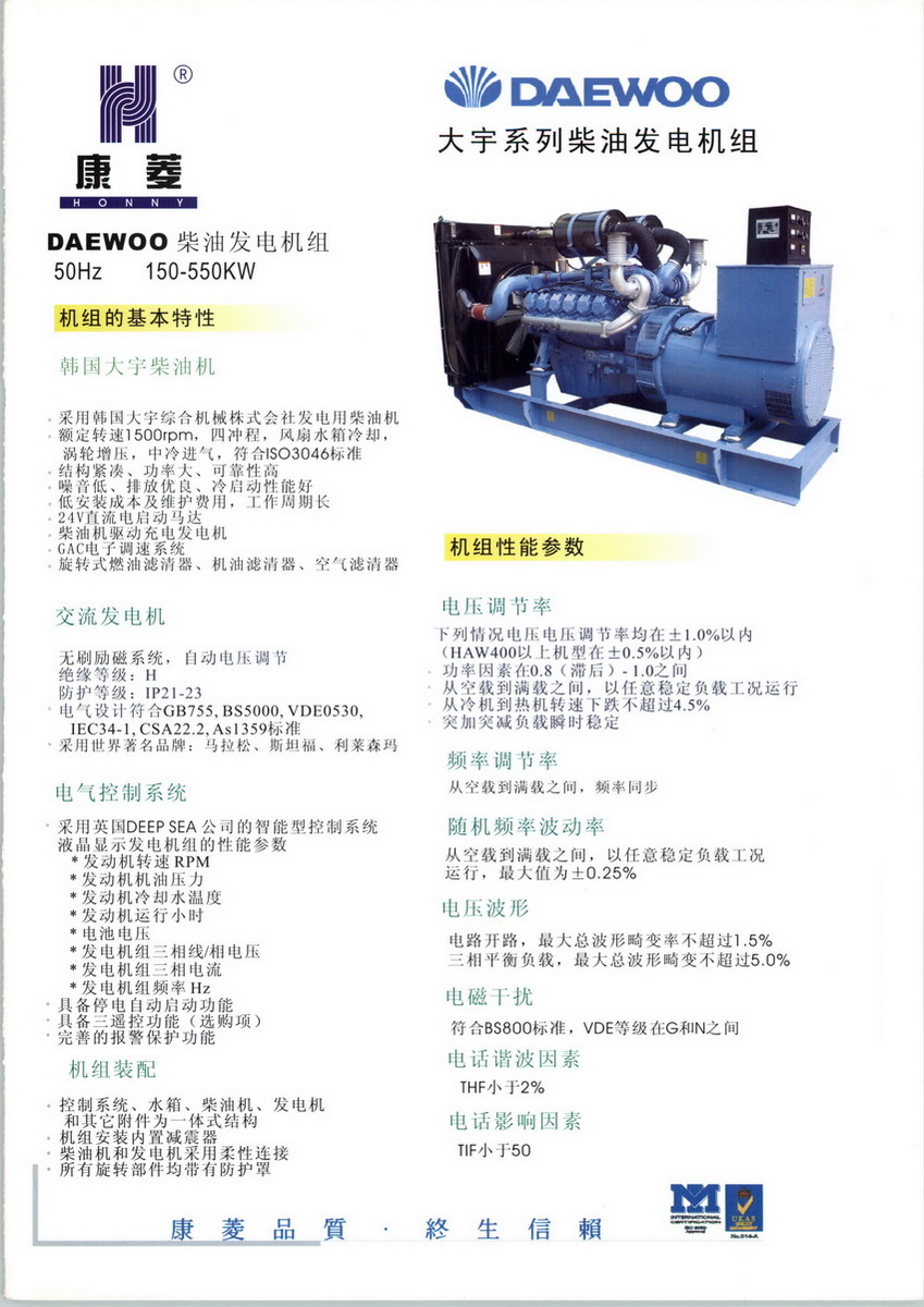 康菱投資(中國(guó))有限公司始創(chuàng)于1992年,是中國(guó)地區(qū)專(zhuān)業(yè)經(jīng)營(yíng)柴油發(fā)電機(jī)組的先驅(qū)之一。專(zhuān)業(yè)從事柴油發(fā)電機(jī)組的生產(chǎn)、銷(xiāo)售、安裝、維修和服務(wù)。經(jīng)過(guò)多年的發(fā)展,目前康菱投資(中國(guó))有限公司在東莞地區(qū)擁有占地近30,000平方米的發(fā)電機(jī)組生產(chǎn)基地。在全國(guó)范圍內(nèi)擁有近30家分公司和辦事處,近30家銷(xiāo)售一級(jí)代理商。公司現(xiàn)有員工1000多人,其中管理人員120多名,技術(shù)人員90多名,生產(chǎn)人員150多名,售后服務(wù)人員280多名,銷(xiāo)售人員400多名。東莞新工廠位于中國(guó)最具發(fā)展?jié)摿Φ母咝录夹g(shù)產(chǎn)業(yè)開(kāi)發(fā)區(qū)— 東莞市松山湖生態(tài)高科技工業(yè)園區(qū),占地面積20,000平方米,年生產(chǎn)能力10,000臺(tái)/套。目前,公司已和多家國(guó)際跨國(guó)公司結(jié)成戰(zhàn)略合作伙伴關(guān)系。與已有40多年發(fā)電機(jī)組生產(chǎn)歷史的新加坡PANEXP集團(tuán)合作,進(jìn)口CUMMINS、PERKINS等系列發(fā)電機(jī)組整機(jī);與世界五大發(fā)電機(jī)組制造商之一的VISA集團(tuán)合作,代理銷(xiāo)售原裝進(jìn)口CUMMINS、PERKINS、MTU、DEUTZ、MAN等系列發(fā)電機(jī)組。公司和康明斯、鉑金斯、斗山大宇、斯坦福、馬拉松、利萊森瑪、上柴股份等國(guó)際、國(guó)內(nèi)著名的發(fā)動(dòng)機(jī)、發(fā)電機(jī)生產(chǎn)廠商建立了長(zhǎng)期友好的合作關(guān)系,并成為他們?cè)谥袊?guó)地區(qū)指定的OEM成套商。公司積極開(kāi)展了多項(xiàng)新產(chǎn)品的研發(fā)工作,其中與中國(guó)南車(chē)集團(tuán)資陽(yáng)柴油機(jī)廠和中國(guó)北車(chē)集團(tuán)永濟(jì)電機(jī)廠聯(lián)合開(kāi)發(fā)的HBY系列火車(chē)機(jī)車(chē)柴油發(fā)電機(jī)組,具有功率大、性價(jià)比高、安全可靠、使用維護(hù)方便等優(yōu)點(diǎn),是缺電地區(qū)、廠礦、醫(yī)院、房地產(chǎn)等用戶的最佳選擇之一。公司于2000年10月通過(guò)了英國(guó)UKAS ISO:9000質(zhì)量體系認(rèn)證,于2004年底通過(guò)了ISO:9001-2000版的換版認(rèn)證2002年獲得廣東省科技廳頒發(fā)的民營(yíng)科技企業(yè)稱(chēng)號(hào);2005年5月獲得了中華人民共和國(guó)信息產(chǎn)業(yè)部的電信入網(wǎng)許可證;2005年7月通過(guò)了國(guó)家內(nèi)燃機(jī)發(fā)電機(jī)組質(zhì)量監(jiān)督檢驗(yàn)中心的質(zhì)量檢查;2005年10月榮獲中國(guó)中輕產(chǎn)品質(zhì)量保障中心頒發(fā)的合格證書(shū)及牌匾。2006年2月榮獲了2005年度東莞市萬(wàn)江區(qū)優(yōu)秀民營(yíng)科技企業(yè)稱(chēng)號(hào)。多年來(lái),對(duì)品質(zhì)、價(jià)格、服務(wù)三方面的和諧統(tǒng)一是全體康菱人的執(zhí)著追求,并換來(lái)了眾多客戶的盛情回饋!衷心感謝中國(guó)電信、中國(guó)移動(dòng)、中國(guó)石油、中海殼牌、中國(guó)煙草、中國(guó)國(guó)家投資公司、中國(guó)水利部、中國(guó)出入境檢驗(yàn)檢疫局、中國(guó)國(guó)家軍委、中國(guó)國(guó)家公安部、美的集團(tuán)、浪莎集團(tuán)、中興通訊、富力地產(chǎn)、鹽城高速;美國(guó)沃爾瑪、高露潔、箭牌、喜來(lái)登、百事可樂(lè)、德?tīng)柛?、德?guó)DHL、法國(guó)湯姆遜、芬蘭NOKIA、瑞士LONZA、日本National、Canon、SANYO、TOYOTA、HONDA、韓國(guó)三星、韓國(guó)艾利和、泰國(guó)正大集團(tuán) 、臺(tái)灣富士康集團(tuán)、臺(tái)灣光寶集團(tuán)等知名客戶對(duì)我們的支持和信賴!